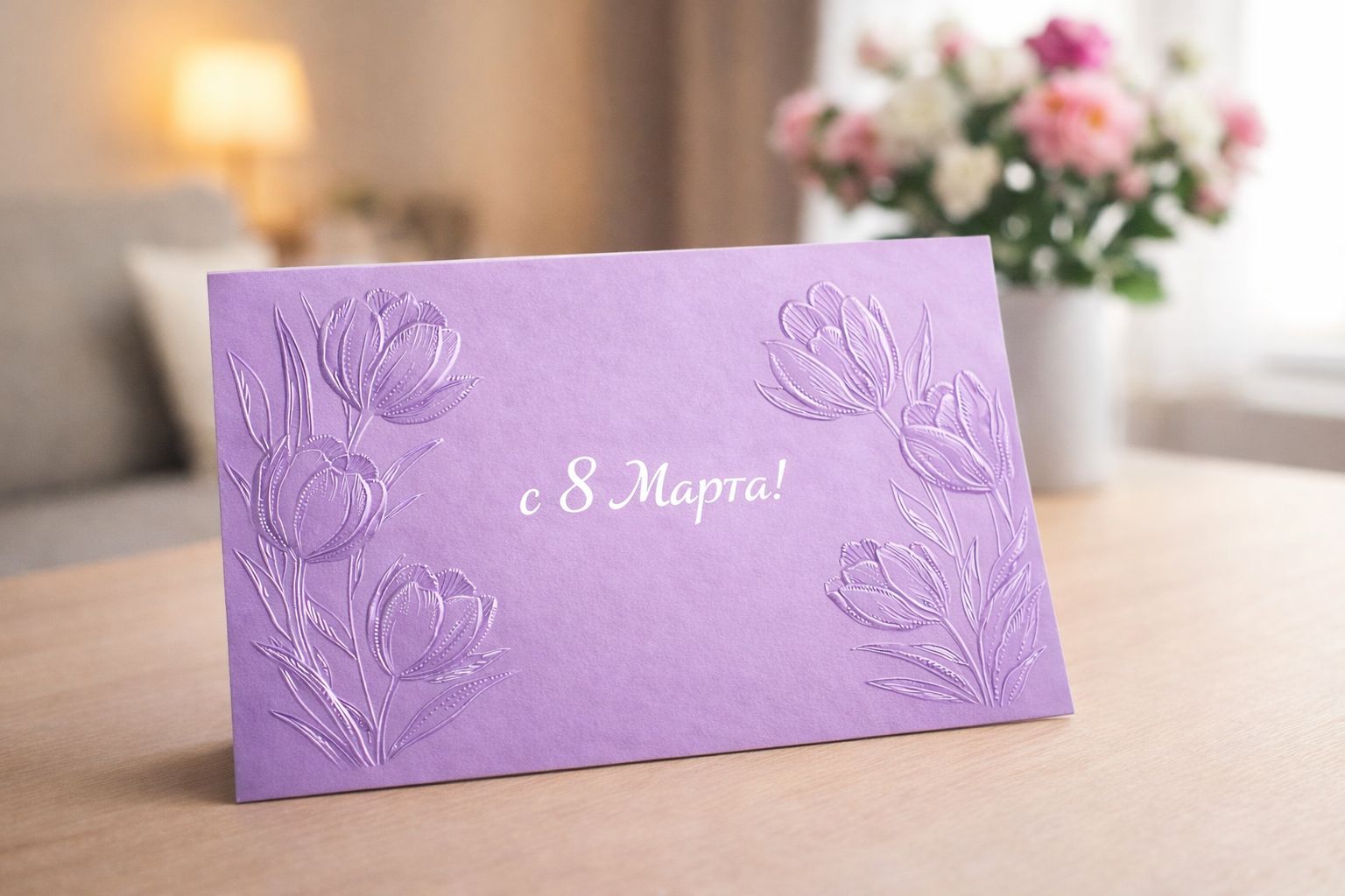 Если открытка идет в конверте, рельеф лучше не тянуть к краю. Небольшие поля уменьшают трение, и поверхность дольше сохраняет вид. Для внутренних страниц и зоны подписи лучше оставить матовую бумагу без отделки.